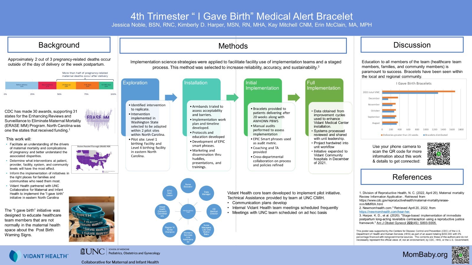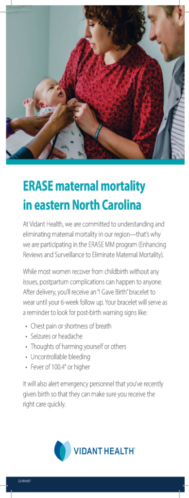 ECU Health Medical Center is the only tertiary care center in Perinatal Region VI; they were influential in allocating best practices and quality improvement initiatives. Below you will see the presentation overview with background, methods, and discussions surrounding the ‘I Gave birth’ initiative. Informational flyer and badge ID cards are included below, serving as a visual reminder of the initiative and care in the 4th trimester.