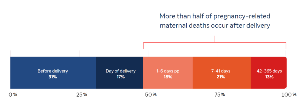 Approximately 2 out of 3 pregnancy-related deaths occur outside of the day of delivery or the week postpartum