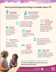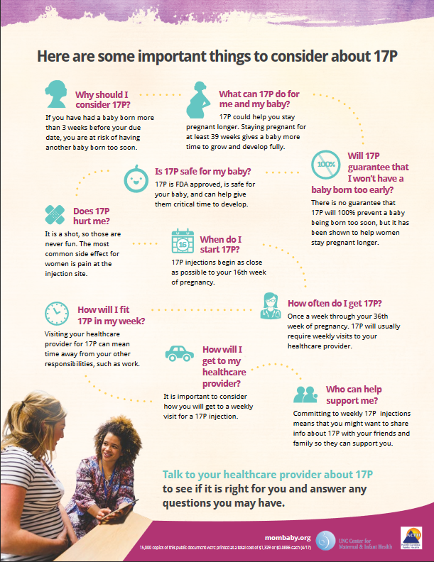 A new one page handout, Is 17P Right for Me?, addresses the most common questions and concerns that women have identified regarding 17P (English and Spanish). The handouts can be ordered through the NC Division of Public Health, Women’s Health Branch. Also now available to order through the Women’s Health Branch is our 17P booklet (English and Spanish) |