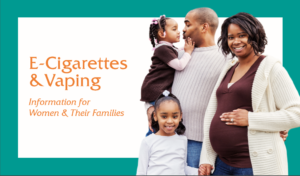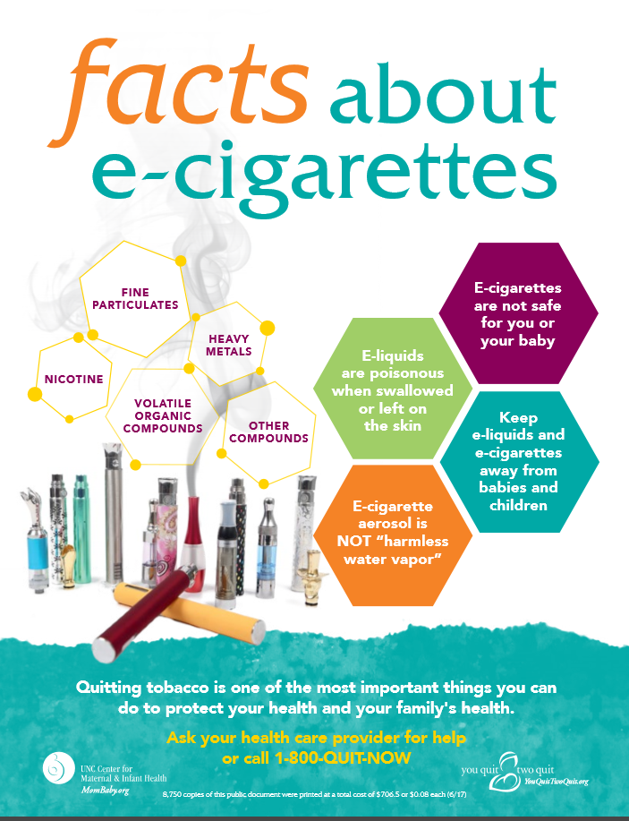 Our new patient education booklet, E-Cigarettes &Vaping: Information for Women & Their Families, provides information for pregnant women and mothers on the risks associated with e- cigarettes and self-help guidance for quitting. This booklet can be ordered through the NC Division of Public Health, Women’s Health Branch. |