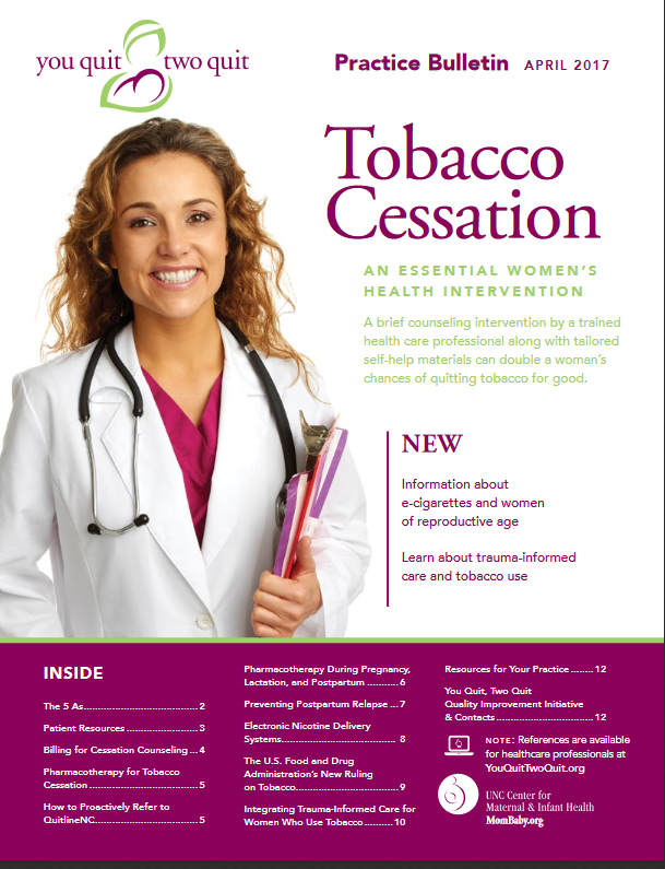 Our new Practice Bulletin is full of information for health care providers about the 5As, resources, billing, pharmacotherapy, preventing postpartum relapse, electronic nicotine device systems, and integrating trauma informed care for women who use tobacco. |